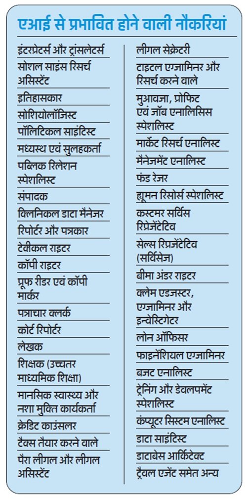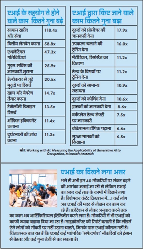भले ही अभी इन 40 नौकरियों पर संकट बढ़ने की आशंका जताई जा रही हो लेकिन एआई का असर कई तरह के कामों में दिखने लगा है। विशेषकर कंटेंट क्रिएशन में…। कई लोग अब एआई की मदद से लेखन का काम कर रहे हैं। प्रजेंटेशन से लेकर अनुवाद करने तक का काम अब आर्टिफिशियल इंटेलिजेंस करने लगा है। नौकरियों में भी एआई को काफी ज्यादा बढ़ावा दिया जा रहा है। माइक्रोसॉफ्ट की रिपोर्ट बताती है कि लीडर्स ऐसे लोगों को नौकरी पर नहीं रखना चाहते, जिनके पास एआई कौशल नहीं है। चिंताजनक बात यह है कि एआई कई पारंपरिक ‘सफेदपोश’ नौकरियों को इंसान से बेहतर और कई गुना तेजी से कर सकता है।