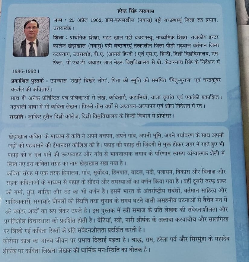 Book Review : खेड़ाखाल छोटी-बड़ी 82 कविताओं का संग्रह है। सोशल मीडिया पर बेबाकी से अपनी बात लिखने वाले लेखक प्रो. हरेंद्र सिंह असवाल का पहला कविता संग्रह है- खेड़ाखाल। लेखक विभिन्न पत्र-पत्रिकाओं में वर्षों से लिख रहे हैं। पाठक उनके लेखन से अनभिज्ञ नहीं हैं। कविता-संग्रह पढ़ते हुए सबसे पहले यह प्रश्न सामने आता है कि कवि ने किताब का नाम ‘खेड़ाखाल’ क्यों रखा? इसका उत्तर कवि के जीवन परिचय और संग्रह में ‘खेड़ाखाल’ शीर्षक कविता से मिलता है। कवि के जीवन को संवारने में शिक्षा का विशेष महत्व रहा है। ‘खेड़ाखाल’ शीर्षक कविता में अपने गांव के प्रति लेखक की संवेदना और मार्मिकता प्रदर्शित होती है। कविता में उन लोगों का नाम उजागर किया गया है जिन्होंने लेखक के क्षेत्र में विद्यालयी शिक्षा को बढ़ावा देने में अपना अमूल्य योगदान दिया है।