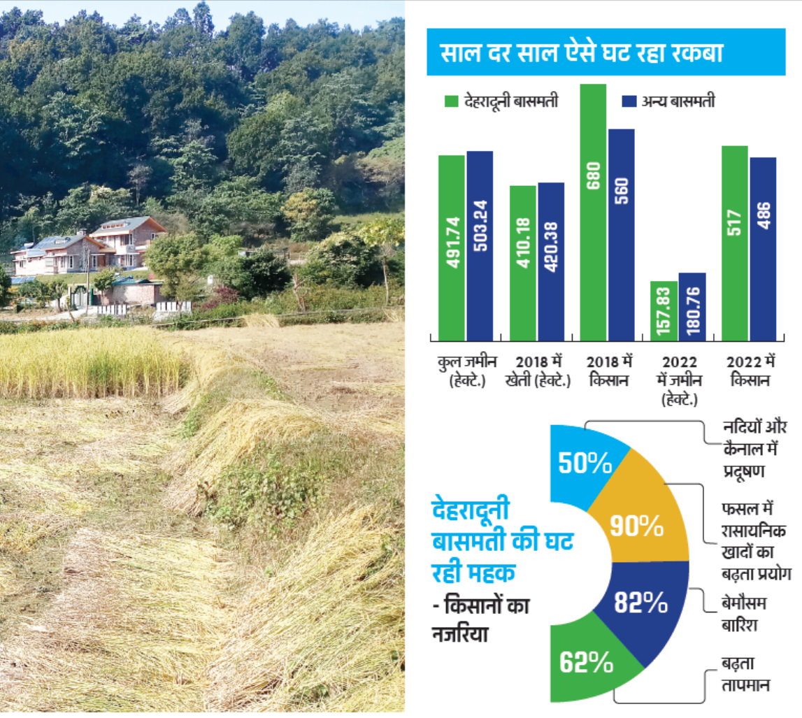 डा. विनोद कुमार भट्ट, हरिराज सिंह, बालेंदु जोशी और कृषि विभाग के तत्कालीन निदेशक एस. एस. रसायिली (आईएफएस) की टीम ने इस शोध के दौरान पाया कि देहरादून में देहरादूनी बासमती की खेती 410 हेक्टेयर से सिर्फ 158 हेक्टेयर पर आ गई है। सहासपुर, विकासनगर, रायपुर, और दोईवाला ब्लॉक्स में देहरादून जिले के 79 गांवों के 1240 किसानों को सर्वे में शामिल किया गया। 2018 में 410.18 हेक्टेयर जमीन पर 680 किसान देहरादूनी बासमती की खेती कर रहे थे। 2022 में 157.83 हेक्टेयर जमीन पर 517 किसान रह गए हैं। इसी तरह अन्य बासमती प्रजातियां, जो पहले 420.38 हेक्टेयर जमीन पर 560 किसानों द्वारा बोई जाती थीं, वे 2022 में 486 किसानों द्वारा 180.76 हेक्टेयर में सिमट गई है। हर साल खेती का रकबा, उत्पादन और किसानों की संख्या कम होती चली गई।