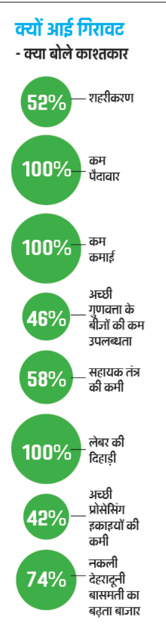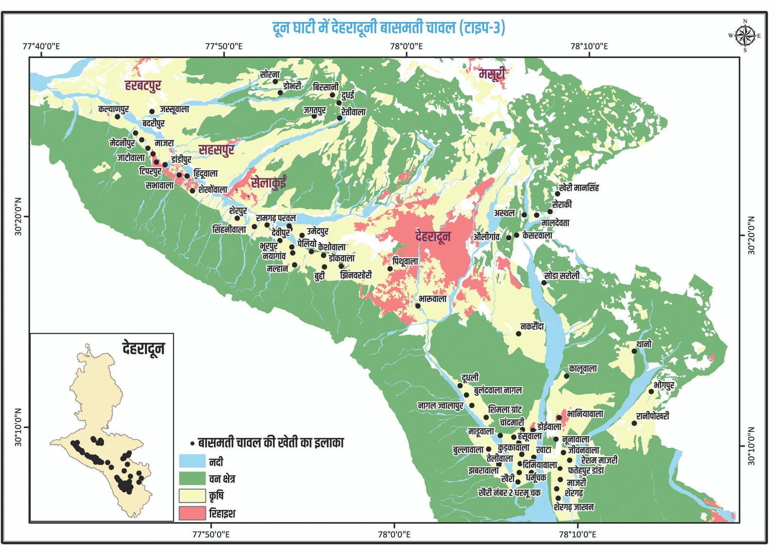 कभी धान की चक्की कहा जाने वाला देहरादून कंक्रीट के जंगलों में तब्दील हो चुका है। शहरीकरण के कारण भूमि की कीमत बढ़ गई। इस कारण किसान अपनी भूमि बेचने और आजीविका के विकल्प को बदलने के लिए प्रेरित हुए। यह रिपोर्ट कहती है कि दून घाटी के कई किसानों ने कम उपज के कारण भी देहरादूनी बासमती उगाना छोड़ दिया है। उन्होंने अन्य चावल किस्मों जैसे कि तरावड़ी (एचबीसी 19), शरबती, कस्तूरी, वर. 1121, सुगंधा और पंत-4 की खेती शुरू कर दी है। 5 फरवरी, 2016 से ‘बासमती’ को जीआई के रूप में पंजीकृत किया गया है। स्थान और संबंधित विशिष्ट गुणवत्ता के कारण भारत सरकार के भौगोलिक संकेत (जीआई) माल (पंजीकरण और संरक्षण) अधिनियम 1999 के तहत संरक्षित है। भौगोलिक संकेत का मतलब होता जो किसी विशिष्ट भौगोलिक क्षेत्र से उत्पन्न होती हैं, जिनमें अद्वितीय विशेषताओं के कारण गुण या प्रतिष्ठा होती है। बासमती चावल सदियों से शिवालिक और हिमालय की तलहटी में उगाया जाता है, जो पंजाब, हरियाणा, उत्तर प्रदेश और उत्तराखंड और पाकिस्तान के पंजाब में फैला हुआ है। उपर्युक्त क्षेत्र की कृषि-जलवायु परिस्थितियों में उगाए जाने पर उनके विशेष गुण होते हैं।