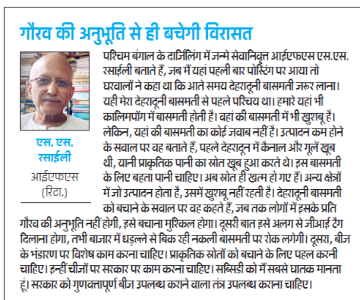 आर्गेनिक अनाज पर काम करने वाली कंपनी नेचर बायो फूड्स के प्रोजेक्ट मैनेजर विजय भट्ट कहते हैं कि हमारे देखते-देखते प्रति बीघा उत्पादन ढाई-तीन क्विंटल से डेढ़-दो क्विंटल हो गया है। गुणवत्ता के बीज कुछ ही किसानों के पास हैं। आठ दस गांव ही हैं जहां गुणवत्तायुक्त देहरादूनी बासमती का उत्पादन हो रहा है। बाकी किसान हाईब्रिड बासमती उगाने लगे हैं। क्योंकि यह धान खेत से उठ जाता है। प्रोडक्शन ज्यादा होता है। पैसे भी मिल जाते हैं। रही बात देहरादूनी बासमती बचाने की तो सरकार को किसानों को तकनीकी सहायता करनी होगी। जैसे, गुणवत्तायुक्त बीज उपलब्ध कराने की जिम्मेदारी उसे उठानी चाहिए। इससे स्थितियां काफी सुधर जाएंगी।