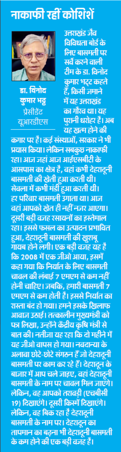 जब सबकुछ इतना अच्छा था तो फिर क्या हुआ बाजार से देहरादूनी बासमती गायब होती चली गई और उसकी जगह वैकल्पिक किस्मों ने ले ली। दिखने और खिलने में भले ही ये नई किस्में बहुत अच्छी हों लेकिन देहरादूनी बासमती की महक कहीं खो गई। इसके कारणों का पता लगाने के लिए जैव विविधता बोर्ड ने साल 2019 में एक शोध कराया था, जिसमें दून घाटी में बासमती की खेती करने में आने वाली दिक्कतों, जहां खेती बंद कर दी गई, वहां के कारण की पहचान की कोशिश की गई। साथ ही देहरादूनी बासमती के बीज संरक्षण, बीज भंडारण, बीज उपचार, खेती, कटाई आदि से जुड़ी अतीत और वर्तमान पारंपरिक प्रथाओं के बारे में भी अध्ययन किया गया। यह शोध उत्तरा रिसोर्स डेवलपमेंट सोसायटी (यूआरडीएस) ने किया था।