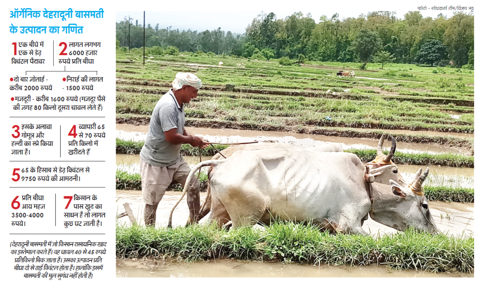 देहरादून के डकानी में अमूल्य निधि ऑर्गेनिक फॉर्म का संचालन करने वाले किसान 72 साल के एसपी बहुगुणा से देहरादूनी बासमती के कम होते उत्पादन पर सवाल पूछा गया तो उनकी भौंहें तन गईं। उन्होंने कई कारण गिनाएं। सरकार से लेकर कृषि बोर्ड के अधिकारियों पर ढेरों सवाल उठा दिए। उन्होंने कहा, यह सरासर फर्जी बात है कि बाजार में मांग बहुत है। असली देहरादूनी बासमती की मांग अगर होती तो किसान उसे जरूर पैदा करते। दूसरी बात देहरादूनी बासमती लगाने से लेकर बेचने तक की प्रक्रिया में किसान को सरकारी तंत्र से कोई सहयोग नहीं मिलता है। पहले कुछ कंपनियां आती थीं। किसानों से सीधे खरीदारी करती थी, अब नहीं आती हैं। छोटे-छोटे व्यापारी धान लेकर जाते हैं। उनकी कोशिश रहती है कि किसानों को कितना ठग लें। सारा मुनाफा अकेले कमाने की फिराक में रहते हैं। किसान एसपी बहुगुणा बताते हैं, देहरादूनी बासमती पूरी तरह ऑर्गेनिक खेती है। इसमें रासायनिक खादों का इस्तेमाल किया गया तो इसकी महक गायब हो जाती है। लेकिन, तमाम किसान रासायनिक खादों का इस्तेमाल कर इसे पैदा कर रहे हैं। व्यापारी इसे सेंट में डुबा देते हैं। इसके बाद बेचते हैं। लोग महक से भ्रमित हो जाते हैं। लेकिन, ऐसे चावल की महक पकाने के बाद गायब हो जाती है। दिक्कत कहां आ रही है? इस पर वह कहते हैं, सरकार रासायनिक खादों पर सब्सिडी देती है लेकिन आर्गेनिक खाद यानी घर में तैयार की जाने वाली खादों पर वह कुछ नहीं देती। देहरादूनी बासमती में इसी खाद का इस्तेमाल किया जाता है।