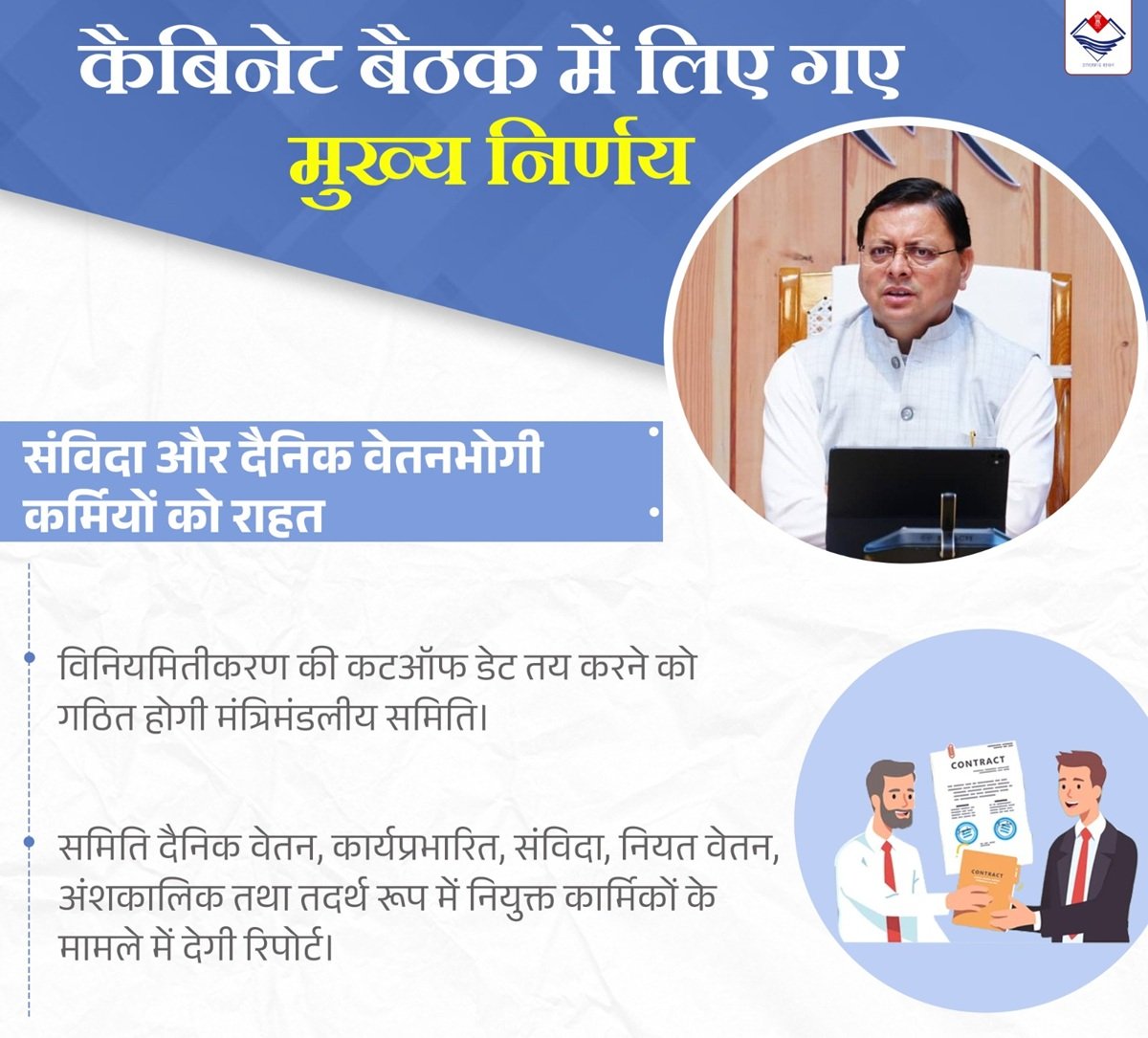 साथ ही, विदेश में उपनल के माध्यम से रोजगार प्रदान करने के लिए उपनल के मेमोरेंडम और आर्टिकल ऑफ एसोसिएशन में संशोधन को मंजूरी दी है। दैनिक वेतनभोगी एवं संविदा कर्मियों के नियमितीकरण के लिए कट ऑफ डेट तय करने के लिए समिति गठित की जाएगी। कैबिनेट के एक अन्य फैसले में आपदा पीड़ितों को बड़ी राहत दी गई है। इसमें धराली और अन्य आपदा प्रभावितों क्षेत्रों में मृत हुए व्यक्तियों के परिवारजनों को दी जाने वाली सहायता राशि अब चार लाख रुपये से बढ़ाकर पांच लाख रुपये होगी। सीएम ने कहा ने कहा कि इन अहम फैसलों में राज्य के सर्वांगीण विकास और जनकल्याण ने को ध्यान में रखा गया है।