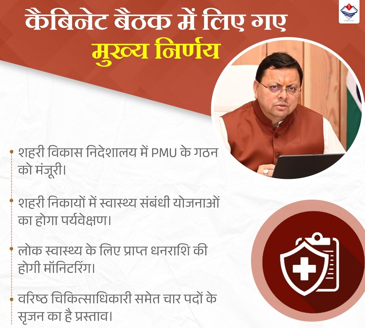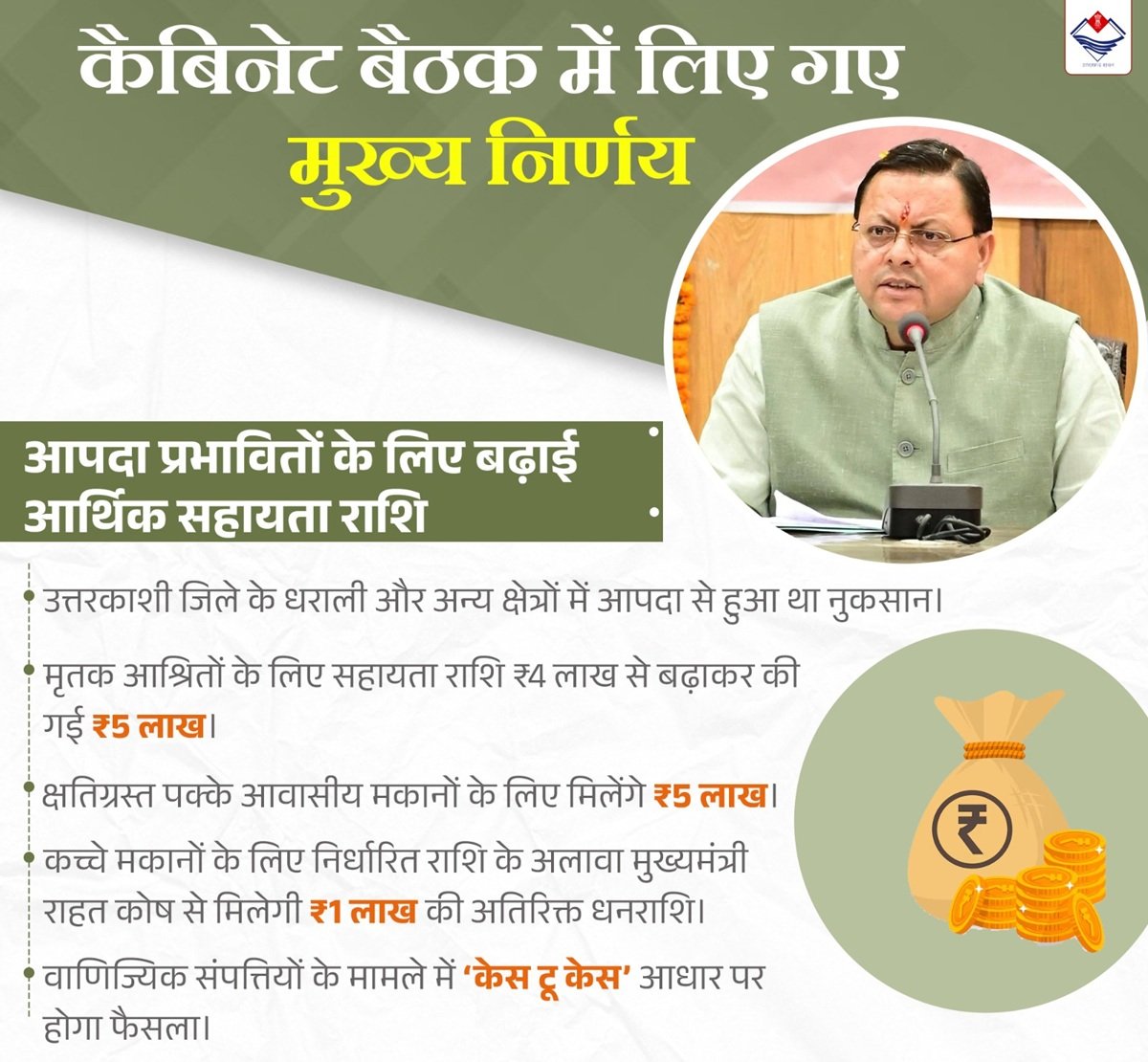 इसके अलावा अब आपदा में क्षतिग्रस्त पक्के मकानों के लिए पांच लाख रुपये तथा कच्चे मकानों के लिए आपदा मद से निर्धारित सहायता राशि के अतिरिक्त एक लाख रुपये की धनराशि मिलेगी। शहरी विकास निदेशालय में पब्लिक हेल्थ पीएमयू के गठन को मंजूरी दे दी गई। इसके अंतर्गत चार नए पदों को भी स्वीकृति दे दी गई। इसके अलावा धामी कैबिनेट ने उपनल कर्मियों की दैनिक मांगों पर विचार के लिए कैबिनेट उपसमिति का गठन किया है।