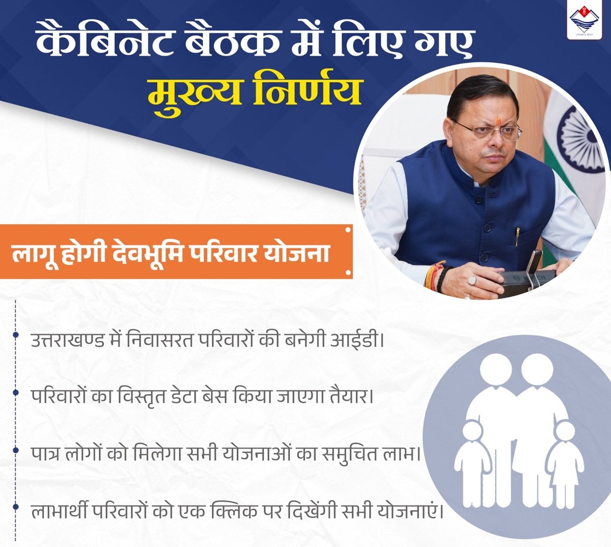धामी कैबिनेट के फैसले : मुख्यमंत्री पुष्कर सिंह धामी की अध्यक्षता में बुधवार को राज्य सचिवालय में आयोजित न कैबिनेट की बैठक में 12 प्रस्तावों को मंजूरी दी गई। इनमें महत्वपूर्ण फैसला है उत्तराखंड में निवासरत परिवारों की पहचान के लिए आईडी जारी की जाएगी। इसका नाम रखा गया है देवभूमि परिवार योजना। इसके तहत सभी परिवारों का विस्तृत डाटा बेस तैयार किया जाएगा। कहा जा रहा है कि इससे राज्य में लागू महत्वपूर्ण एवं जनोपयोगी विभिन्न योजनाओं का लाभ लाभार्थी परिवार को आसानी से मिल जाएगा। साथ ही एक क्लिक में रजिस्टर परिवार की जानकारी उपलब्ध होगी।