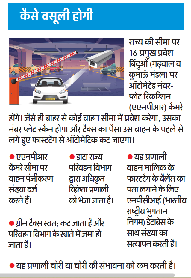 खास बात यह है कि यह कर पूरी तरह से स्वचालित डिजिटल प्रणाली के माध्यम से वसूला जाएगा। यह संग्रह प्रक्रिया पूरी तरह से स्वचालित होगी और इसमें स्वचालित नंबर प्लेट पहचान (एएनपीआर) कैमरे लगाए जाएंगे, जिन्हें 37 राज्य प्रवेश बिंदुओं पर लगाया जा रहा है। चूंकि वाहनों से होने वाला उत्सर्जन शहरी और पहाड़ी क्षेत्रों में प्रदूषण का एक प्रमुख कारण बना हुआ है, इसलिए वास्तविक समय निगरानी और प्रत्यक्ष भुगतान कटौती का यह मॉडल भारत के अन्य पहाड़ी या पारिस्थितिक रूप से संवेदनशील राज्यों के लिए एक आदर्श बन सकता है। रजत जयंती वार्षिकोत्सव के मौके पर हुई घोषणा के मुताबिक, 1 दिसंबर से ग्रीन सेस वसूला जाना था। लेकिन, तकनीकी कारणों से प्रक्रिया धरातल पर नहीं उतर पाई। बताया जा रहा है कि ग्रीन सेस कलेक्शन के लिए तैयार सॉफ्टवेयर का अभी तक एनपीसीआई (नेशनल पेमेंट्स कॉर्पोरेशन ऑफ इंडिया) और भारत सरकार की वाहन डेटा बेस से इंटीग्रेशन नहीं हो पाया है। संभावना जताई जा रही है कि नए साल से पहले ग्रीन सेस कलेक्शन की प्रक्रिया शुरू हो सकती है।