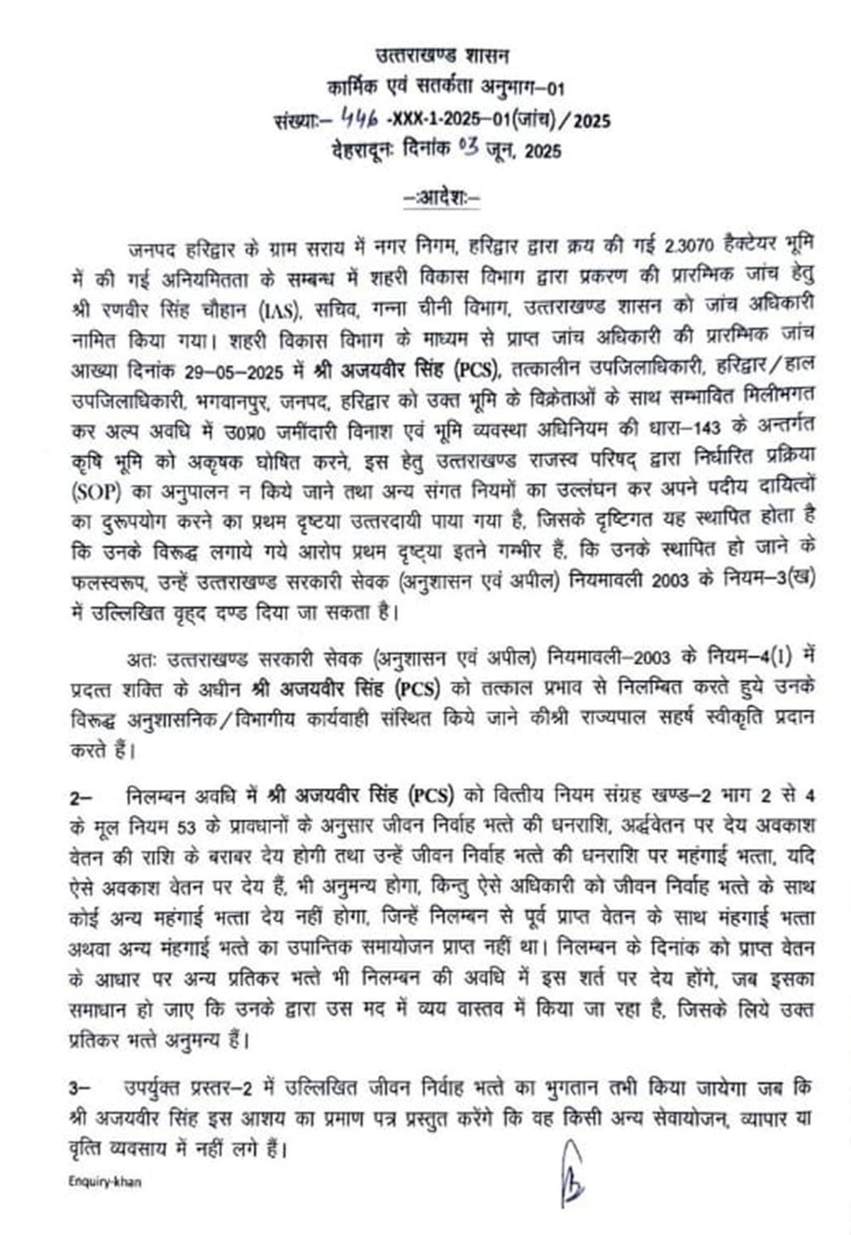 हरिद्वार नगर निगम द्वारा ग्राम सराय में कूड़े के ढेर के पास स्थित अनुपयुक्त 2.3070 हेक्टेयर भूमि को करोड़ों रुपये में खरीदने पर सवाल उठने के बाद, मुख्यमंत्री पुष्कर सिंह धामी ने इस प्रकरण की जांच के आदेश दिए थे। जिसके बाद सचिव रणवीर सिंह चौहान ने मामले की प्रारंभिक जांच कर, रिपोर्ट 29 मई को ही शासन को सौंपी थी। इसी जांच रिपोर्ट के आधार पर मुख्यमंत्री ने कार्मिक विभाग को दोषी अधिकारियों के खिलाफ कार्रवाई के निर्देश दिए थे। जिस पर कार्मिक एवं सतर्कता विभाग ने आज सभी सात आरोपित अधिकारियों को निलंबित करने के आदेश जारी कर दिए।