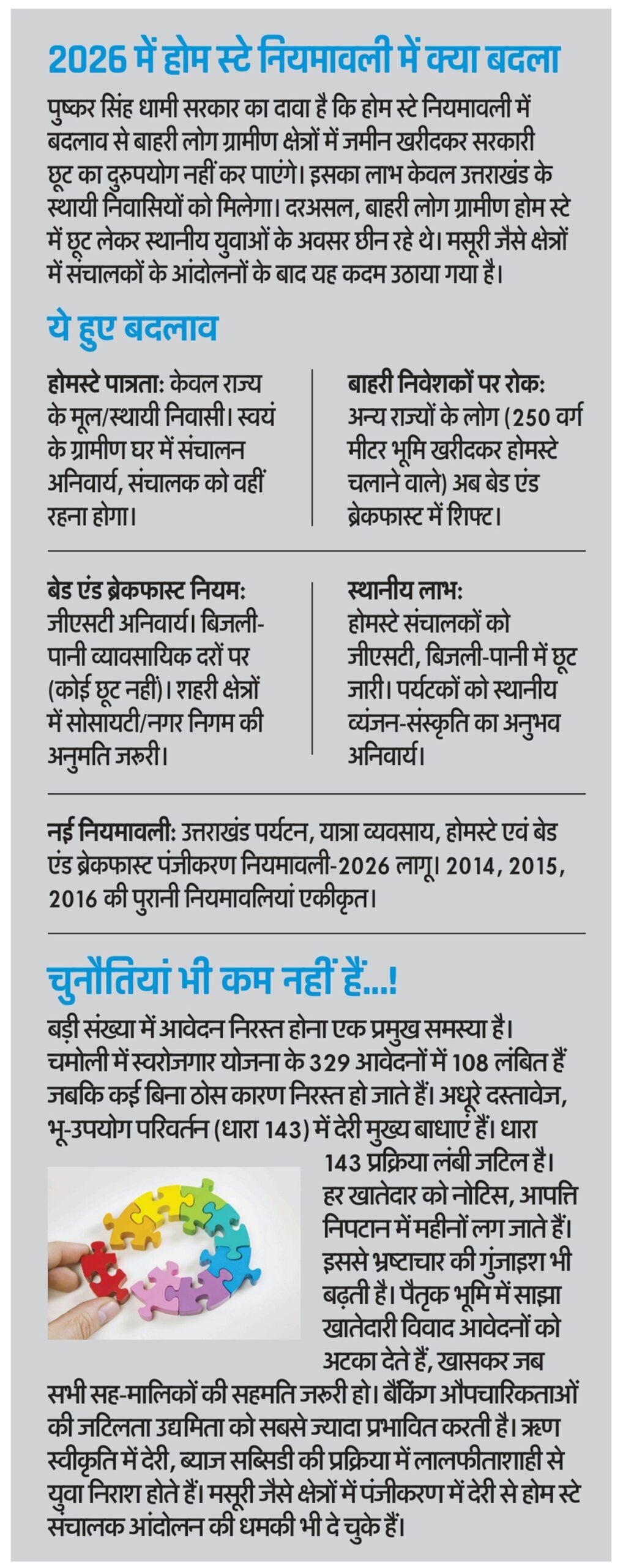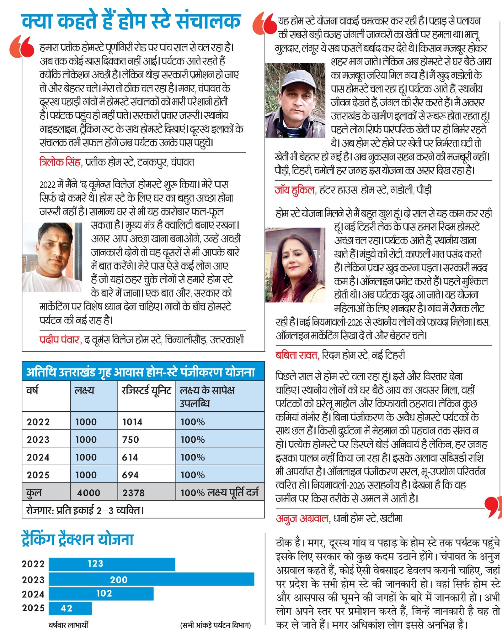 यह बदलाव धीरे-धीरे, घर-घर और गांव-गांव उतर रहा है। यह बदलाव पूरी अर्थव्यवस्था की दिशा मोड़ रहा है। आज उत्तराखंड में छह हजार से अधिक होम स्टे पंजीकृत हैं। पर्यटन विभाग के मुताबिक, नैनीताल में 909 होमस्टे रजिस्टर्ड हैं, जो पूरे उत्तराखंड में सबसे अधिक हैं। इसके अलावा जिले में 995 होटल, रिसॉर्ट और टैंट कॉलोनियां भी संचालित हो रही हैं। बीते 5 साल में कुल 660 नई इकाइयां स्थापित हुई हैं। ये आंकड़े साफ दर्शाते हैं कि पर्यटन उद्योग तेजी से विस्तार कर रहा है और युवाओं के लिए कमाई के नए रास्ते खोल रहा है। खास यह है कि सीमांत जिले पिथौरागढ़ में 700 से ज्यादा होम स्टे पंजीकृत हो चुके हैं। ये आंकड़े बताते हैं कि योजना के प्रति लोगों में उत्साह कैसा है। हालांकि, इसका नकारात्मक पहलू भी सामने आया। होम स्टे का लाभ कुछ बाहरी राज्यों से आए लोग भी उठाने लगे है। यही कारण है कि प्रदेश सरकार ने होम स्टे नियमावली में बदलाव किया है। अब स्थानीय निवासियों को ही इस योजना का लाभ मिलेगा।