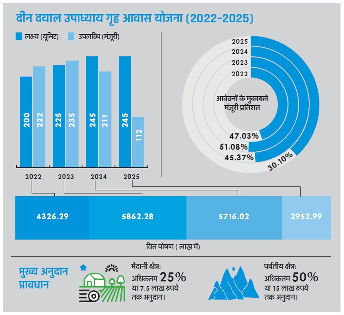 दीन दयाल उपाध्याय गृह आवास योजना उत्तराखंड की उन योजनाओं में है जिसने पर्यटन को गांव के दरवाज़े तक पहुंचाया। इसका मूल विचार है कि स्थानीय लोगों के घरों को ही पर्यटन इंफ्रास्ट्रक्चर का हिस्सा बनाना। 2022 से 2025 के बीच इस योजना के अंतर्गत 915 लक्ष्यों के मुकाबले 780 परियोजनाओं को स्वीकृति दी गई। लगभग 44.09 प्रतिशत की स्वीकृति दर के साथ कुल 18,857.58 लाख रुपये का वित्त पोषण हुआ। मैदानी क्षेत्रों में प्रति इकाई 25 प्रतिशत या अधिकतम 7.5 लाख रुपये और पर्वतीय क्षेत्रों में 50 प्रतिशत या अधिकतम 15 लाख रुपये तक का अनुदान तय किया गया। इन प्रावधानों ने यह सुनिश्चित किया कि केवल बड़े होटल या रिसॉर्ट ही नहीं बल्कि छोटे पहाड़ी मकान भी पर्यटन मानचित्र पर आ सकें। दो-तीन कमरों वाले घर, जिनमें कभी रिश्तेदार ठहरते थे अब पर्यटकों के लिए स्थानीय संस्कृति का अनुभव बन गए हैं। इस योजना का प्रभाव केवल आय तक सीमित नहीं है। हर इकाई से 1–2 लोगों को रोजगार की संभावना और कुल मिलाकर 1500 से अधिक प्रत्यक्ष रोजगार सृजन का लक्ष्य रखा गया। इसके साथ महिलाओं की भागीदारी भी बढ़ी है। किचन, हाउसकीपिंग, स्थानीय व्यंजन और अतिथि सत्कार में महिलाओं की भूमिका केंद्रीय होती जा रही है।