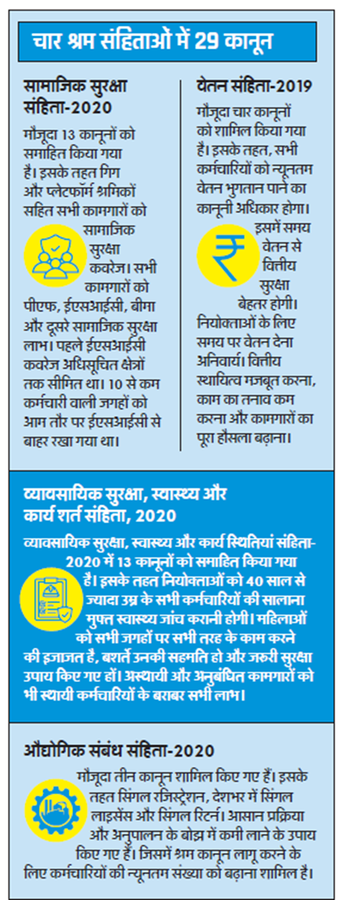 अब काम के घंटों से लेकर वेतन तक के नियम हैं। इससे उद्यमों पर अनुपालन का बोझ होगा। सामाजिक सुरक्षा का विस्तार होगा। खतरनाक उद्योगों में एक भी श्रमिक काम करता है, तो ईपीएफओ के दायरे में आएगा। पहले की तरह 10 श्रमिकों की अनिवार्यता नए कानून में नहीं है।