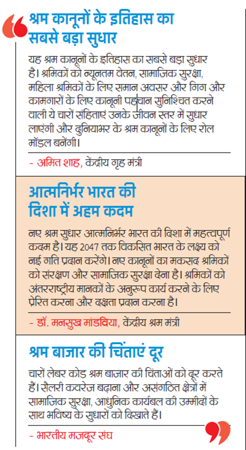 केंद्र सरकार का दावा है कि यह कानून कर्मचारियों के हित में है, क्योंकि पुराने कई श्रम कानून स्वतंत्रता-पूर्व और स्वतंत्रता-उत्तर काल (1930-1950) में बने थे। जब अर्थव्यवस्था और रोजगार की प्रकृति आज से बिल्कुल अलग थी। इन पुराने कानूनों के कारण श्रमिकों और उद्योगों दोनों को अनुपालन में कठिनाई होती थी। अधिकांश देश पहले ही अपने श्रम नियमों को आधुनिक बना चुकी हैं, जबकि देश में पुराने कानून के मुताबिक ही काम किया जा रहा था। केंद्र सरकार का दावा है कि वेतन संहिता 2019, औद्योगिक संबंध संहिता 2020, सामाजिक सुरक्षा संहिता 2020 और व्यावसायिक संहिता 2020 के दायरे में 40 करोड़ श्रमिक आएंगे। पहली बार गिग वर्कर्स और प्लेटफॉर्म वर्कर्स को भी शामिल किया गया है। नियुक्ति पत्र देना अनिवार्य कर दिया गया है। ग्रेच्युटी की सीमा घटाकर एक वर्ष कर दी गई है। न्यूनतम वेतन का दायरा बढ़ाया गया है। सरकार का मानना है कि इससे रोजगार और औद्योगिक व्यवस्था में सुधार होगा। नए लेबर लॉ में समय पर वेतन देने का नियम है। सरकार ने तर्क है कि नए कानूनों से रोजगार की शर्तों की पारदर्शिता बढ़ेगी। देशभर में न्यूनतम वेतन लागू होगा। खास बात यह है कि हर पांच साल में कानूनों की समीक्षा की व्यवस्था की गई है। यानी, इसे संशोधित किया जा सकेगा। सरकार इसे आजादी के बाद मजदूरों के लिए सबसे बड़े प्रगतिशील सुधारों में से एक मान रही है।