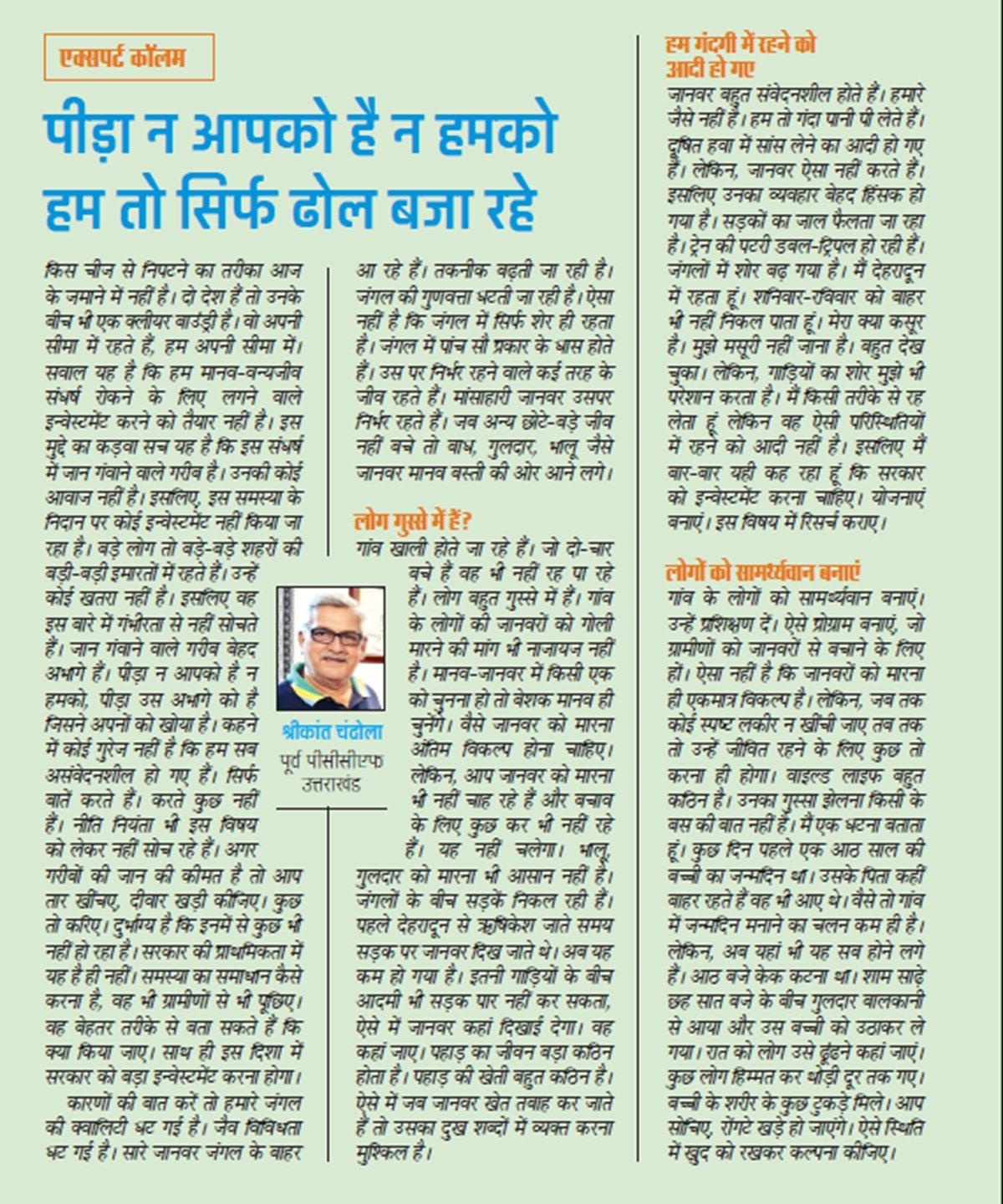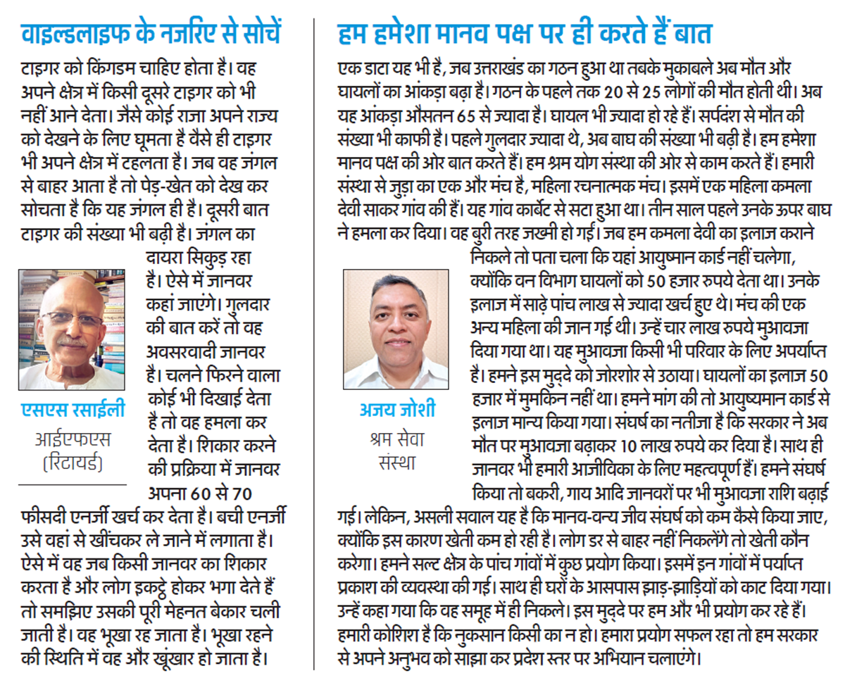 भारतीय वन सेवा से सेवानिवृत्त एसएस रसाइली कहते हैं, हमें जानवरों के नजरिये से भी सोचना होगा। पहाड़ों-जंगलों के बीच कितनी सुरंग-पुल बन गए हैं। आप कभी जंगलों के ऊपर से गुजरे पुल के नीचे खड़े होकर देखें। अजीब घनघनाहट होती है। ऐसा लगता है कि जैसे पुल नीचे आ जाएगा। आप-हम जानते हैं कि वह नहीं गिरेगा। लेकिन, बेजुबान जानवर क्या समझेंगे। यह मुद्दा ऐसा है, दोनों पक्ष यानी मानव और वन्यजीव पीड़ित हैं। दोनों के नजरिये से सोचते हुए हल निकालने पर सोचना होगा।