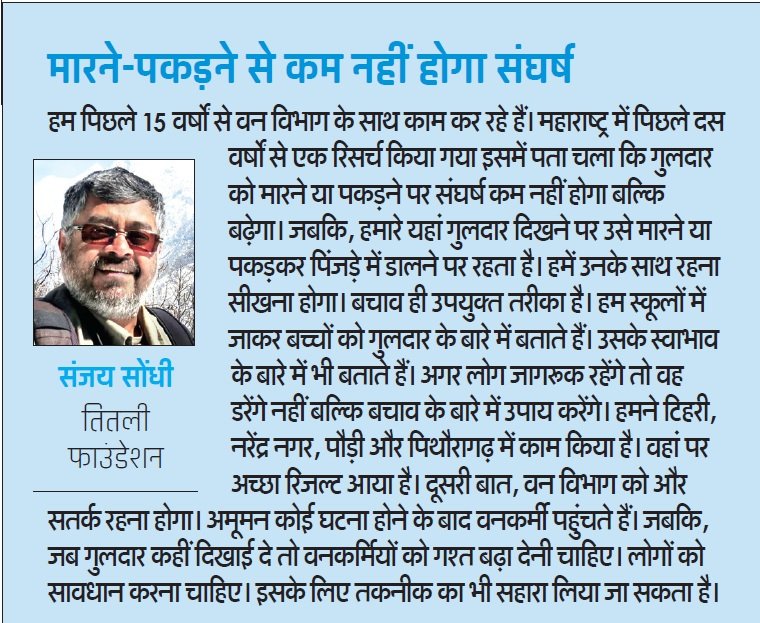 विशेषज्ञ कहते हैं, वन विभाग को कागजी नहीं, जमीनी शोध करना होगा। ये काम जंगल के किसी एक हिस्से में नहीं बल्कि बड़े स्तर पर हो। तब जाकर मानव-वन्यजीव संघर्ष रोकने की दिशा में ठोस पहले हो सकती है। मैदानी क्षेत्र में बाघों की संख्या में काफी बढ़ोतरी होने की वजह से भी गुलदार दूसरे जंगलों में पहुंच रहे हैं। पर्वतीय क्षेत्र में तो गुलदार सबसे बड़ी चुनौती बन चुके हैं। इसलिए कभी आंगन में खेल रहे बच्चे, खेत में काम कर महिला और घास लेकर घर को लौट रही बुजुर्ग इनका निवाला बन रही है। राज्य के हर जिले में घटनाएं हुई। गुलदारों के हमले के मामले में कुमाऊं के अल्मोड़ा, पिथौरागढ़, चंपावत, बागेश्वर के अलावा गढ़वाल के पर्वतीय जिले संवेदनशील श्रेणी में है। उसके बावजूद उत्तराखंड वन विभाग के पास मानव-वन्यजीव संघर्ष को रोकने के लिए कोई प्रभावी योजना नहीं है। कुछ डिवीजनों को छोड़ अन्य में वनकर्मियों के पास सुरक्षा संसाधन तक नहीं है।
