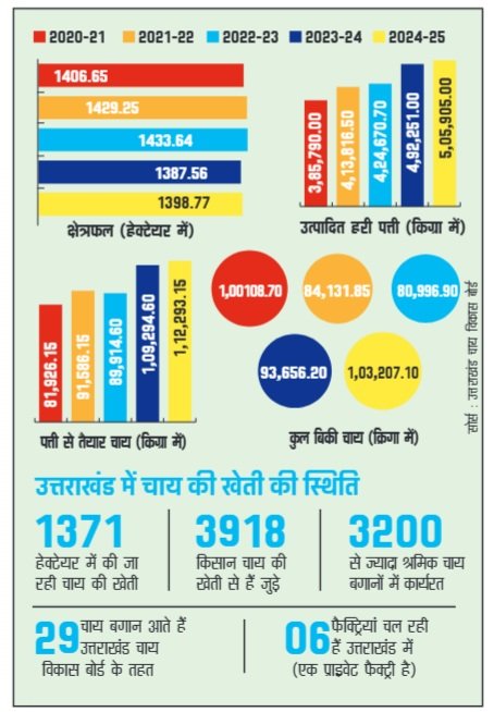 इसके अलावा चंपावत, घोड़ाखाल, गैरसैंण और कौसानी में स्थित चाय बागानों में करीब 80 हजार किलो प्रति वर्ष चाय का उत्पादन हो रहा है। उत्पादित चाय का अधिकांश हिस्सा कोलकाता बिक्री के लिए भेज दिया जाता है, जबकि बचा हुआ कुछ प्रतिशत उत्तराखंड में ही रिटेल में बेचा जाता है। अब उत्तराखंड टी बोर्ड ने चाय बागानों में पैदा होने वाली चाय का स्वाद आम लोगों को चखाने के लिए यहां के सभी बाजारों में चाय की बिक्री करने का फैसला किया है। वर्तमान परिदृश्य की बात करें तो 2024-25 में कुल 1398.77 हेक्टेयर में चाय की बागबानी की गई थी। इससे पांच लाख पांच हजार नौ सौ पांच किलोग्राम हरी पत्ती का उत्पादन हुआ था। प्रोसेसिंग के बाद 1,09,294 किलो ग्राम चाय पत्ती बनाई गई। अगर अपने पड़ोसी राज्य हिमाचल प्रदेश से तुलना करें तो हम बहुत पीछे हैं। हिमाचल में 2310.714 हेक्टेयर में चाय की खेती की जा रही है। 12 लाख किलोग्राम से अधिक का उत्पादन होता है। यानी वह हमसे डेढ़ गुना से कुछ ज्यादा क्षेत्रफल में बागबानी करते हैं जबकि उत्पादन हमसे 12 गुना ज्यादा होता है। हालांकि, पिछले पांच वर्षों का आकलन करें तो पता चलता है कि उत्पादन में लगातार वृद्धि हो रही है। 2020-21 में जहां 1406 हेक्टेयर में बागबानी कर 3,85,79.00 किलोग्राम हरी पत्तियों का उत्पादन किया गया था वहीं, इस बार 1398 हेक्टेयर में पांच लाख से अधिक किलोग्राम पत्तियों का उत्पादन किया गया। थोड़ा ही सही लेकिन, 2020 से 2025 के बीच हर साल उत्पादन में बढ़ोतरी हुई है। हम उत्तराखंडी कई चीजों में अपनी तुलना पड़ोसी राज्य हिमाचल से करते हैं। यहां पर जब हम तुलना करते हैं तब दिक्कत शुरू