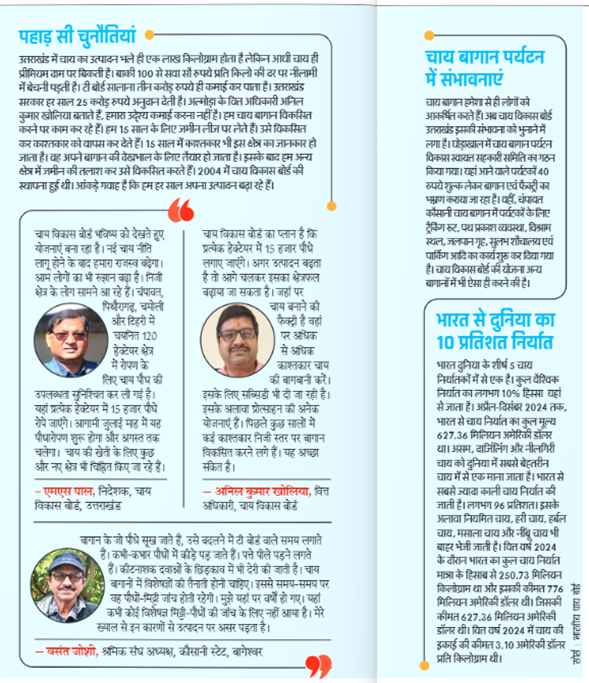हिमालय के इस हिस्से की चाय के किस्से अपने स्वाद की तरह ही रोमांचक हैं। कभी इन पहाड़ों के चाय बागानों की पत्तियों के जायके की सात समंदर पार तक धमक थी। आज वही पहाड़ चाय उत्पादन की होड़ में नजर नहीं आता। उत्तराखंड चाय विकास बोर्ड उसी स्वर्णिम दौर को वापस लाने की कोशिश में लगा हुआ है। कोशिश हो रही है कि चाय की कड़क चुस्की में रोजगार की मिठास घुल जाए। शायद तभी, उत्तराखंड में चाय का स्वर्णिम दौर लौट पाएगा। धरातल पर योजनाओं को उतारने की मशक्कत हो रही है। हालांकि, चुनौतियां पहाड़ सी हैं। 2004 में उत्तराखंड चाय विकास बोर्ड की स्थापना की गई थी। आज 21 साल बीत चुके हैं, लेकिन आज भी बोर्ड उत्तराखंड सरकार से हर साल मिलने वाले 25 करोड़ रुपये तक की सहायता राशि पर निर्भर है। यानी, चाय विकास बोर्ड उतनी कमाई नहीं कर पा रहा है जिससे वह काश्तकारों-श्रमिकों को पैसे अदा कर पाए। अपना खर्च उठा पाए।