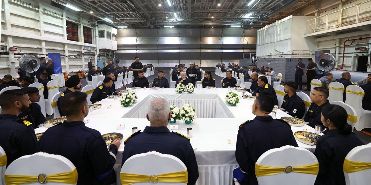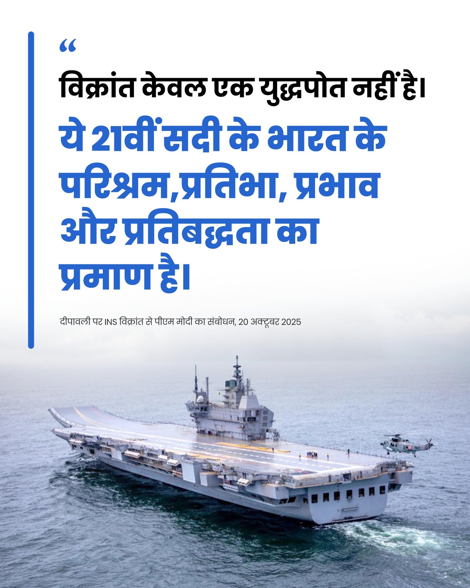 पीएम नरेंद्र मोदी ने आईएनएस विक्रांत पर दिवाली मनाते हुए अपने संबोधन में कहा, मैं भाग्यशाली हूं कि इस बार मैं दिवाली का यह पावन त्योहार नौसेना के आप सभी वीर जवानों के बीच मना रहा हूं। विक्रांत पर बिताई कल की रात, इस अनुभव को शब्दों में कहना कठिन है। प्रधानमंत्री नरेंद्र मोदी ने इस साल गोवा के तट पर INS विक्रांत पर भारतीय नौसेना के जवानों के साथ दिवाली मनाई। इस दौरान प्रधानमंत्री ने अपने हाथों से जवानों को मिठाई खिलाई और उनके देशभक्ति गीतों को सुना।