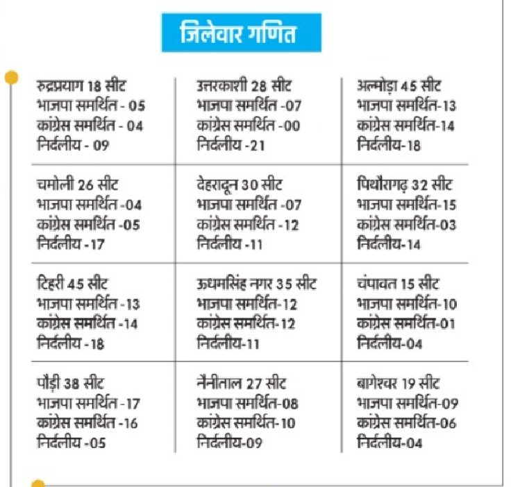 त्रिस्तरीय पंचायत चुनाव में कई राजनीतिक दिग्गजों की साख दांव पर थी। इसमें भाजपा के पूर्व जिलाध्यक्ष और पूर्व ब्लॉक प्रमुख भी अपनी सीट नहीं बचा पाए। वहीं भाजपा समर्थित करीब छह से सात सीटें तो आई हैं, लेकिन उनके दिग्गज अपनी सीट नहीं बचा पाए। भटवाड़ी विकासखंड में पूर्व दो ब्लॉक प्रमुख सहित पुरोला में भाजपा के पूर्व जिलाध्यक्ष हार गए। पुरोला में जिला पंचायत सीट पर रामा वार्ड सबसे हॉट सीट बनी हुई थी। क्योंकि यहां भाजपा के पूर्व जिला पंचायत अध्यक्ष सतेंद्र राणा, पूर्व नगरपालिका अध्यक्ष हरिमोहन नेगी और जिला पंचायत अध्यक्ष दीपक बिजल्वाण मैदान में थे। इसमें दीपक बिजल्वाण ने सतेंद्र राणा से करीब 1200 मतों के अंतर से जीत दर्ज की। वहीं भटवाड़ी में पूर्व ब्लॉक प्रमुख विनीता रावत मैदान में थीं। वह करीब डेढ़ सौ मतों से अपने प्रतिद्वंद्वी से हार गईं। साथ ही पूर्व में भटवाड़ी ब्लॉक प्रमुख रहे और जिला पंचायत सदस्य चंदन पंवार इस बार तीसरे नंबर पर रहे। इस बार के चुनाव में अप्रत्याशित मतों के कारण कई दिग्गजों को हार का सामना करना पड़ा। यह सभी हारने वाले प्रत्याशी भाजपा के दिग्गज हैं। भाजपा प्रदेश अध्यक्ष महेंद्र भट्ट के प्रभाव वाले क्षेत्र बदरीनाथ से भी भाजपा प्रत्याशी को हार का सामना करना पड़ा। चमोली में भाजपा को सबसे करारी हार मिली है।