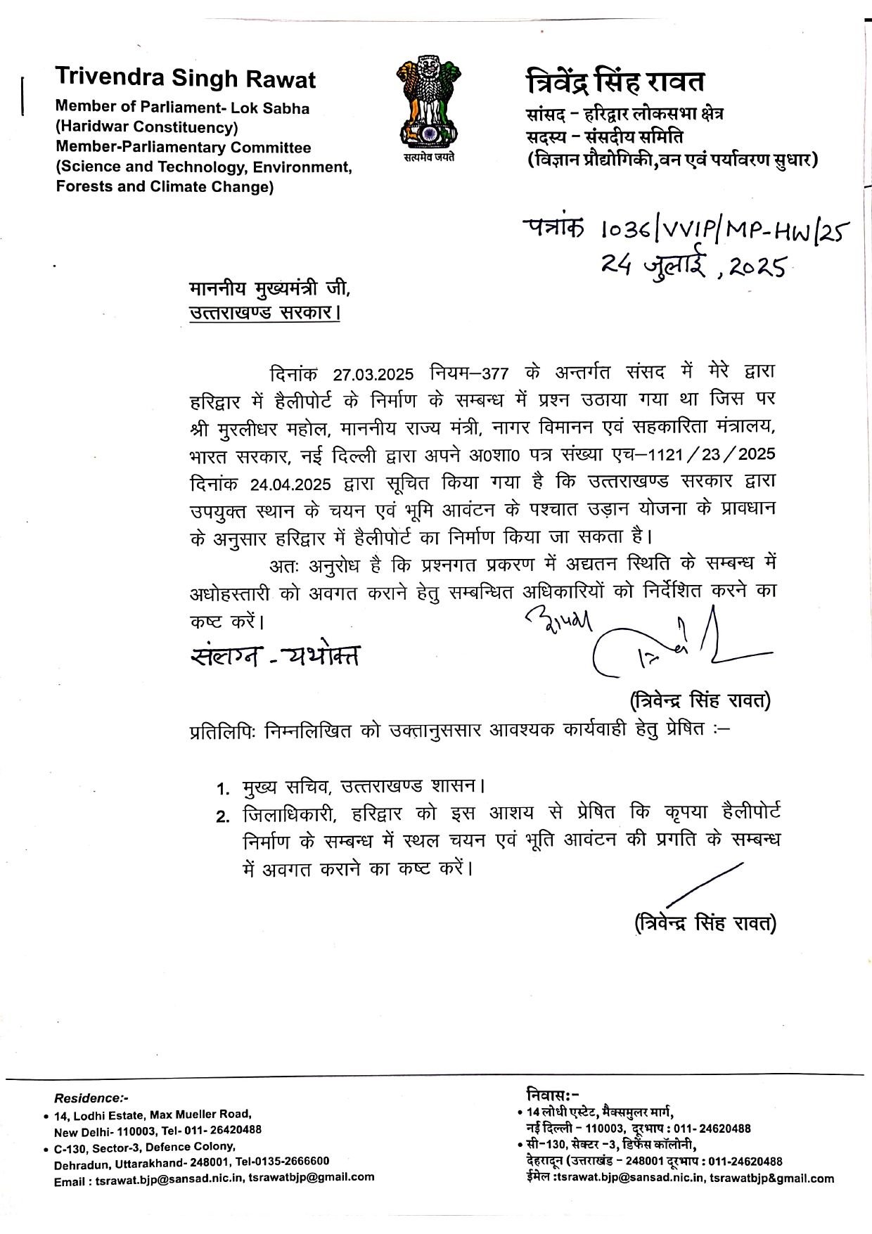 हरिद्वार सांसद त्रिवेंद्र सिंह रावत ने 27 मार्च, 2025 को संसद में नियम 377 के तहत हरिद्वार में हेलीपोर्ट के निर्माण के संबंध में सवाल उठाया था। इसके लिखित जवाब में केंद्रीय नागर विमानन व सहकारिता राज्यमंत्री मुरलीधर मोहोल ने जानकारी दी थी कि राज्य सरकार द्वारा उपयुक्त स्थान के चयनीकरण और भूमि आवंटन के बाद हेलीपोर्ट का विकास उड़ान योजना के प्रावधानों के अनुसार किया जाएगा।