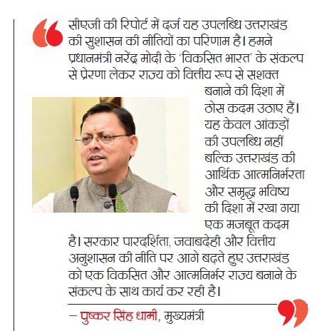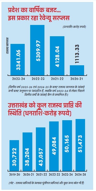 स्थापना के 25वें वर्ष में Uttarakhand के खाते में एक महत्वपूर्ण उपलब्धि आई है। भारत के नियंत्रक एवं महालेखा परीक्षक (CAG) द्वारा राज्यों की वित्तीय स्थिति पर किए गए दशकीय अध्ययन के अनुसार 16 राज्य राजस्व अधिशेष की स्थिति में हैं, जिसमें उत्तर प्रदेश सबसे अग्रणी है। खास बात यह है कि इसमें अपना उत्तराखंड भी शामिल है। यानी राज्य की कमाई उसके खर्च से ज्यादा है। उत्तराखंड ने वित्तीय वर्ष 2022-23 में 5,310 करोड़ रुपये का राजस्व अधिशेष दर्ज कर ऐतिहासिक उपलब्धि हासिल की है।