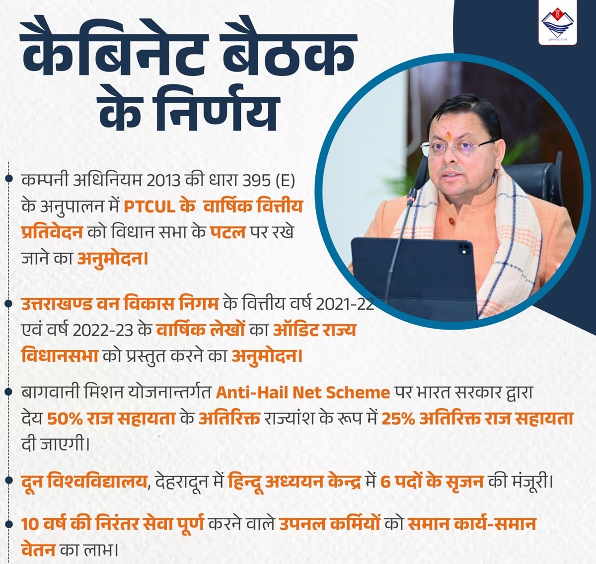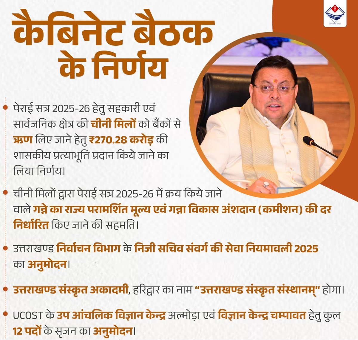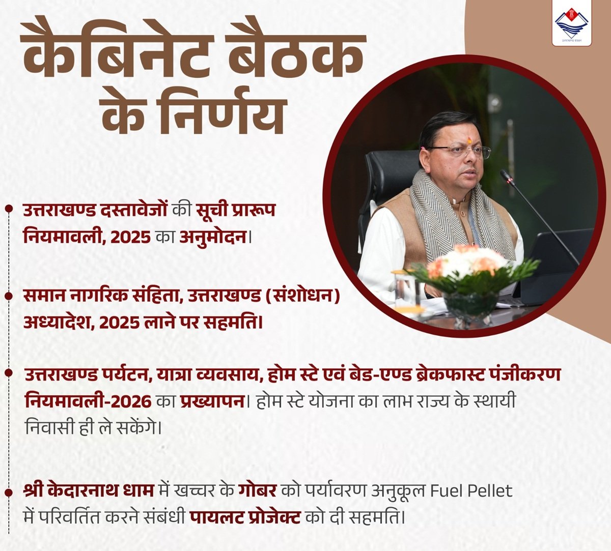 कैबिनेट बैठक में कुल 19 प्रस्तावों पर मुहर लगी। जिनमें उपनल कर्मियों के मानदेय के अलावा समान नागरिक संहिता (यूसीसी) में संशोधन और होम-स्टे नीति में बदलाव प्रमुख रहे। उपनल कर्मियों के लिए यह निर्णय चरणबद्ध रूप से लागू किया जाएगा। पहले चरण में वर्ष 2015 तक 10 साल की सेवा पूरी कर चुके लगभग 8 हजार कर्मचारियों को तत्काल लाभ मिलेगा। इसके बाद 2016 और 2018 तक सेवा अवधि पूरी करने वाले कर्मियों को शामिल किया जाएगा। कैबिनेट सचिव शैलेश बगौली ने बताया कि यह फैसला नैनीताल हाईकोर्ट के कुंदन सिंह बनाम उत्तराखंड राज्य मामले में दिए गए निर्देशों और मंत्रिमंडलीय उप-समिति की सिफारिशों के आधार पर लिया गया है। फैसले के बाद उपनल कर्मियों के प्रतिनिधिमंडल ने मुख्यमंत्री से भेंट कर आभार जताया।
