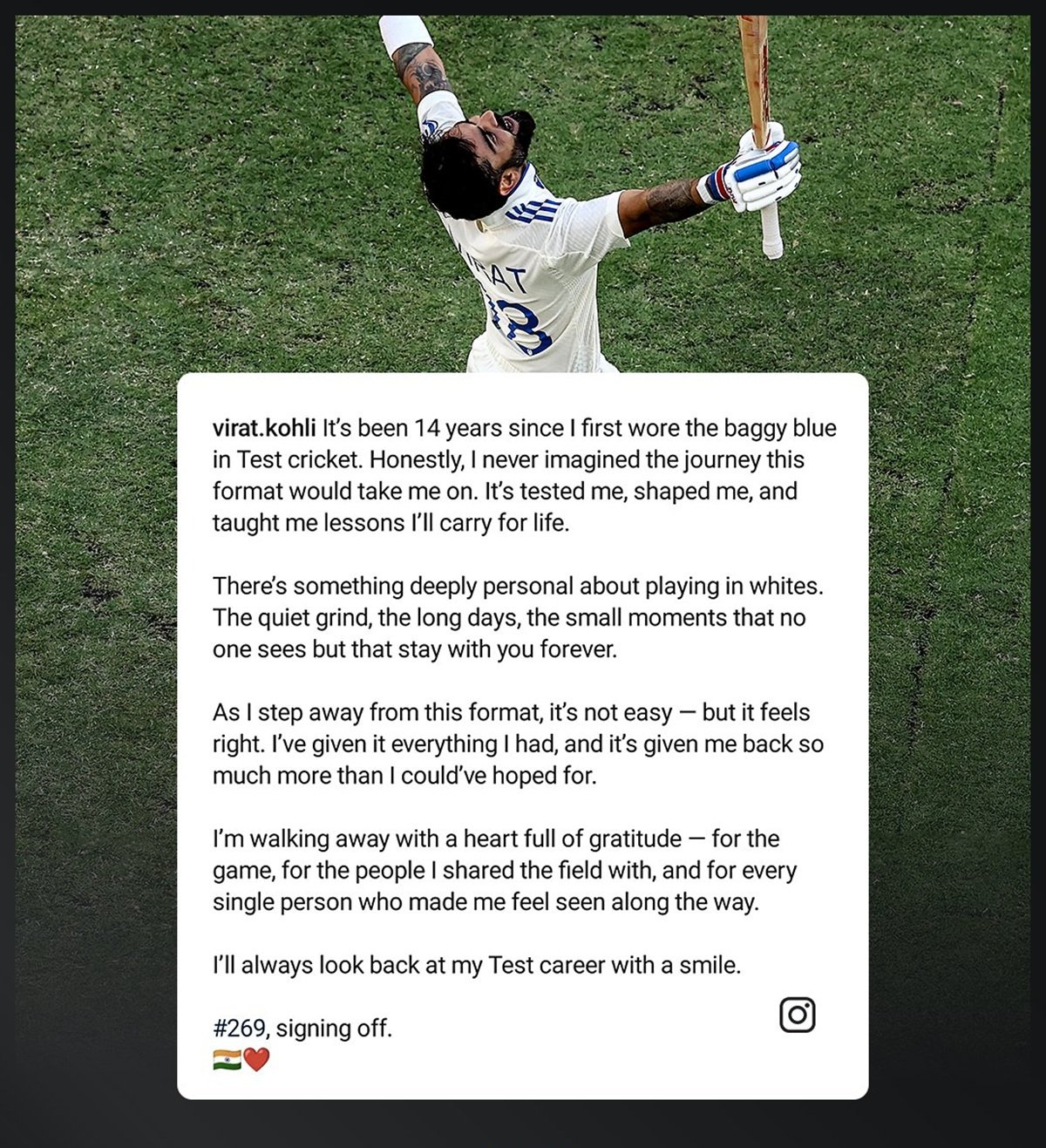 कोहली ने अपने सोशल मीडिया हैंडल्स पर एक फोटो शेयर करते हुए कैप्शन लिखा, टेस्ट क्रिकेट में पहली बार बैगी ब्ल्यू पहने हुए 14 साल हो चुके हैं। ईमानदारी से कहूं तो मैंने कभी कल्पना नहीं की थी कि यह प्रारूप मुझे किस सफर पर ले जाएगा। इसने मेरी परीक्षा ली, मुझे आकार दिया और मुझे ऐसे सबक सिखाए, जिन्हें जीवनभर अपने साथ रखूंगा। सफेद कपड़ो में खेलना बहुत ही निजी अनुभव होता है। शांत वातावरण, लंबे दिन, छोटे-छोटे पल जिन्हें कोई नहीं देखता, लेकिन जो हमेशा आपके साथ रहते हैं। जैसे ही मैं इस प्रारूप से दूर होता हूं, यह आसान नहीं है – लेकिन यह सही लगता है। कोहली ने लिखा, मैंने इसमें अपना सबकुछ दिया है, और इसने मुझे मेरी उम्मीद से कहीं ज्यादा दिया है। मैं दिल से आभार के साथ जा रहा हूं – खेल के लिए, उन लोगों के लिए जिनके साथ मैंने मैदान साझा किया, और हर एक व्यक्ति के लिए जिसने मुझे इस दौरान देखा। मैं हमेशा अपने टेस्ट करियर को मुस्कुराते हुए देखूंगा। 269 साइनिंग ऑफ।